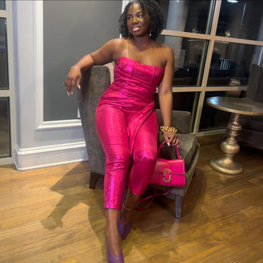 Turn heads in this bold fuchsia strapless jumpsuit, featuring a shimmering metallic finish and a...