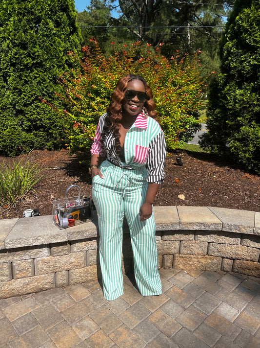 Multi-color striped long sleeve collared button up with matching high waist drawstring wide legs pants...