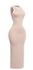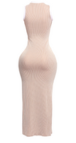 Sleek, sculpted, and effortlessly bold—the Amara Ribbed Maxi is your go-to for a body-hugging slay with minimal effort. This sleeveless high-neck maxi dress features a soft, stretchy double ribbed knit fabric that smooths and contours with ease. The neutral nude hue makes it easy to dress up or down, and the length keeps it elegant while still giving body.