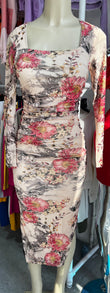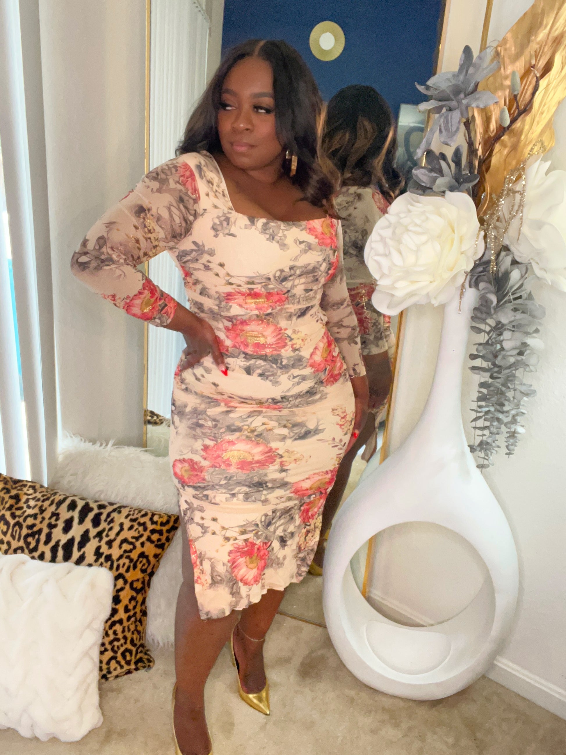 Elevate your style with our Blush Floral Midi Dress. Featuring a square neck, long sleeves, ruching detail and elegant floral prints with gold accents, this dress exudes sophistication. The side splits add a touch of allure, making it perfect for both casual and dressy occasions. Step into the spotlight with this chic and timeless piece.