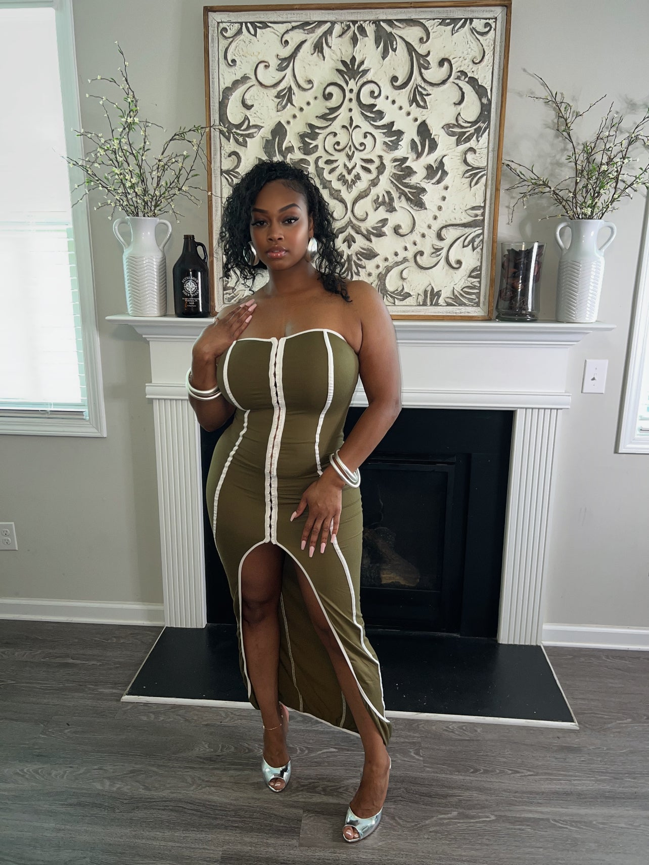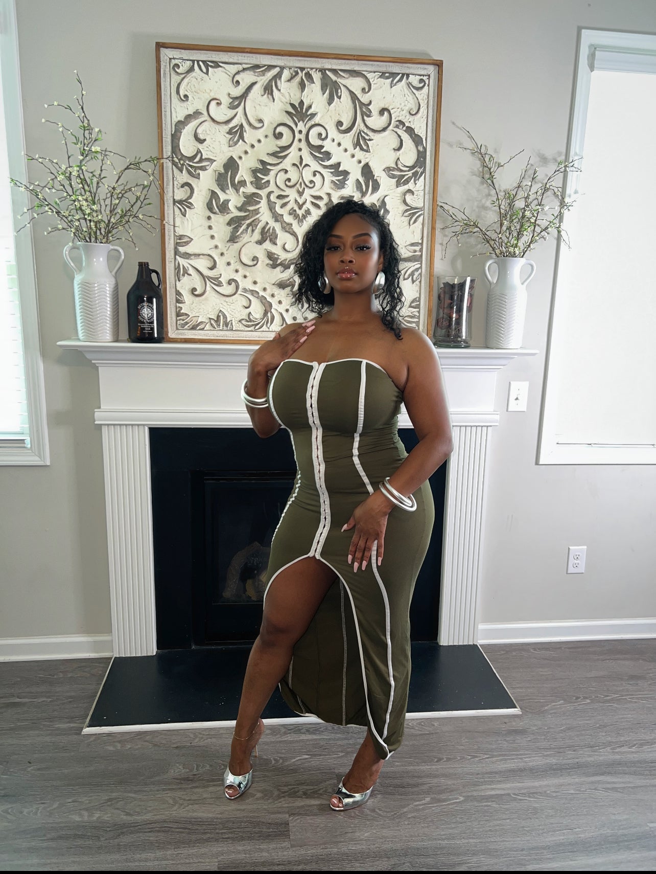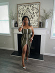 Bold and body-hugging, the Cinch Me Up Dress brings head-turning energy in olive green with sharp white piping detail. This strapless statement dress features a daring front slit and full hook-and-eye closures running down the front for a secure, sculpted fit. With its curve-contouring design and structured lines, it’s the ultimate piece for a sleek, show-stopping look.