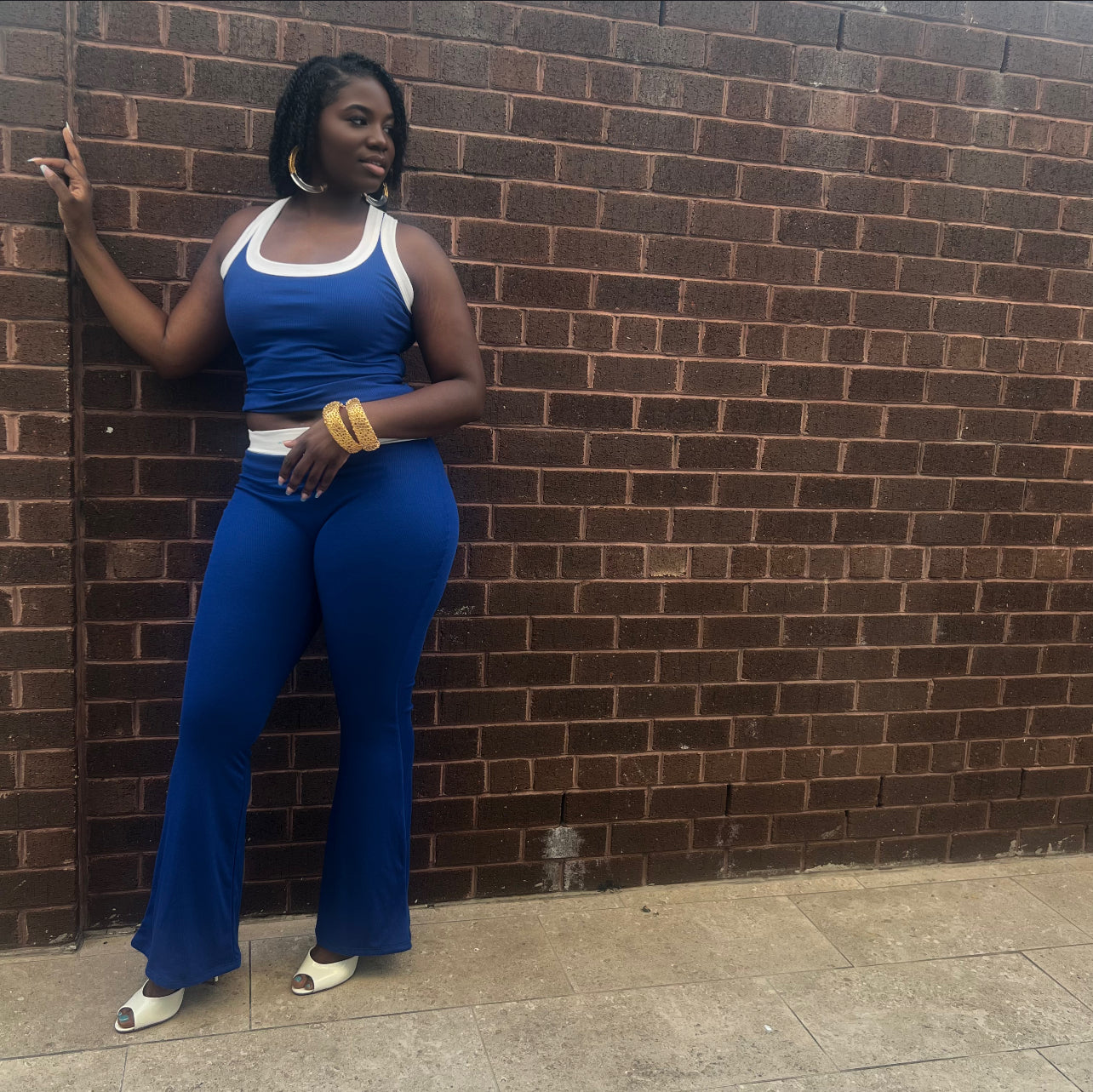 Step into sporty chic with the Contrast Cutie Flare Set—where throwback flair meets modern edge. This ribbed set features a bold white-trim tank and high-waisted flared pants that hug your curves and elongate your frame. Whether you're brunching or running errands, this look is a standout.