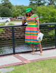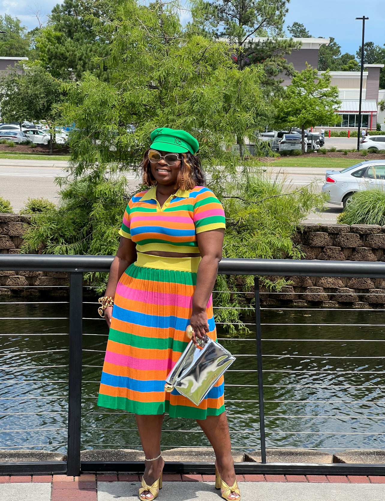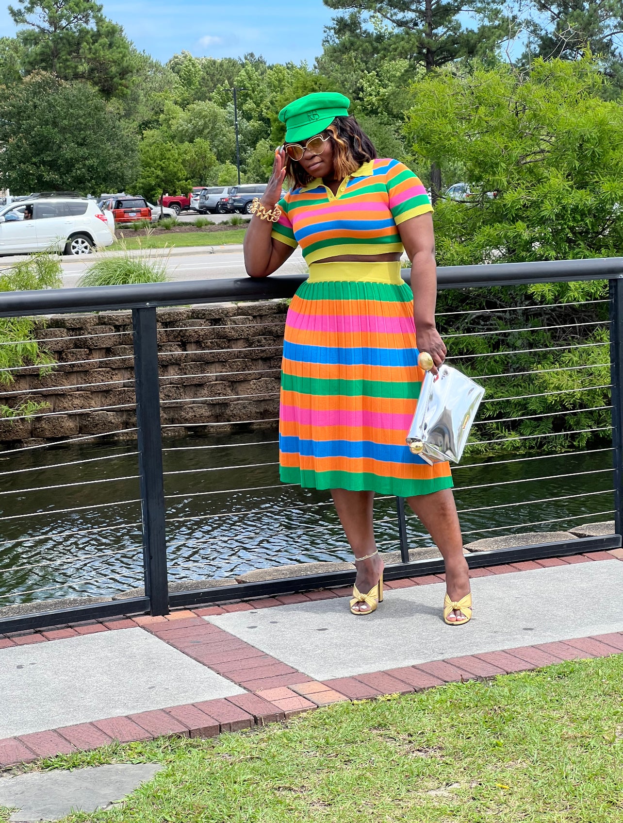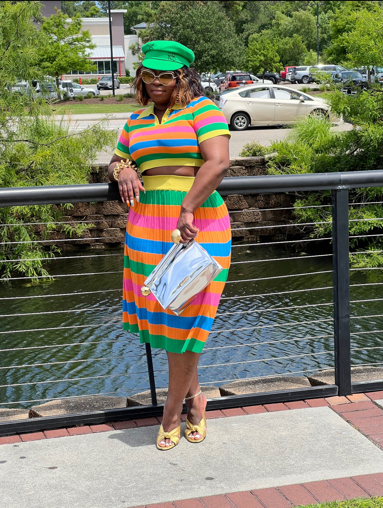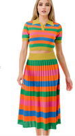 Say hello to bold color and playful vibes in the Dainty Candy Pop Set—a vibrant two-piece that’s anything but shy. Featuring a cropped knit top with a polo collar and a matching pleated midi skirt, this set is bursting with standout hues like electric blue, hot pink, tangerine, and neon green. It’s giving sweet, sassy, and unapologetically fly.