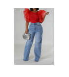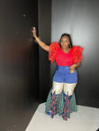 This bold red bodysuit features dramatic tulle sleeves and a flattering fitted design. The vibrant color and unique sleeve detail add a fun, fashion-forward touch, perfect for pairing with jeans or skirts for a chic, standout look.