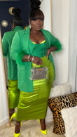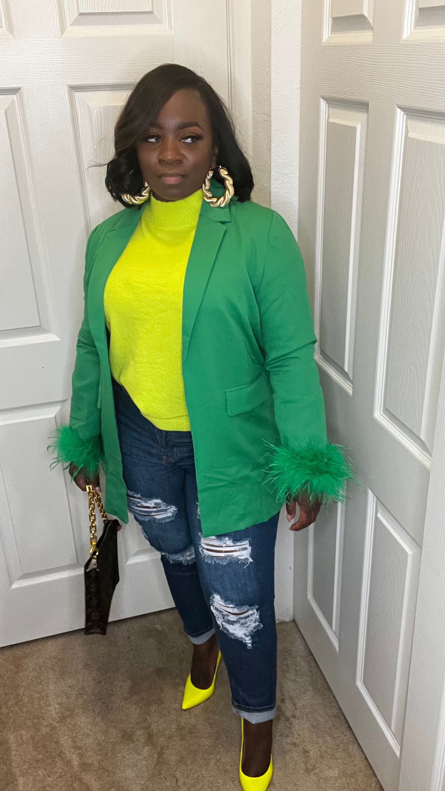 - Green Oversized Feather Wrist Blazer (meant to come above or right at the wrist)
