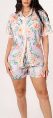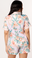 Step into soft sophistication with the Garden Glam Set—a lightweight two-piece that blends elegance with effortlessness. The collared button-up top and matching high-waisted shorts are drenched in a dreamy floral print featuring pastel peach, coral, sage, and sky blue hues over a soft lavender-pink base. Feminine, floaty, and flattering—this set makes casual look elevated.