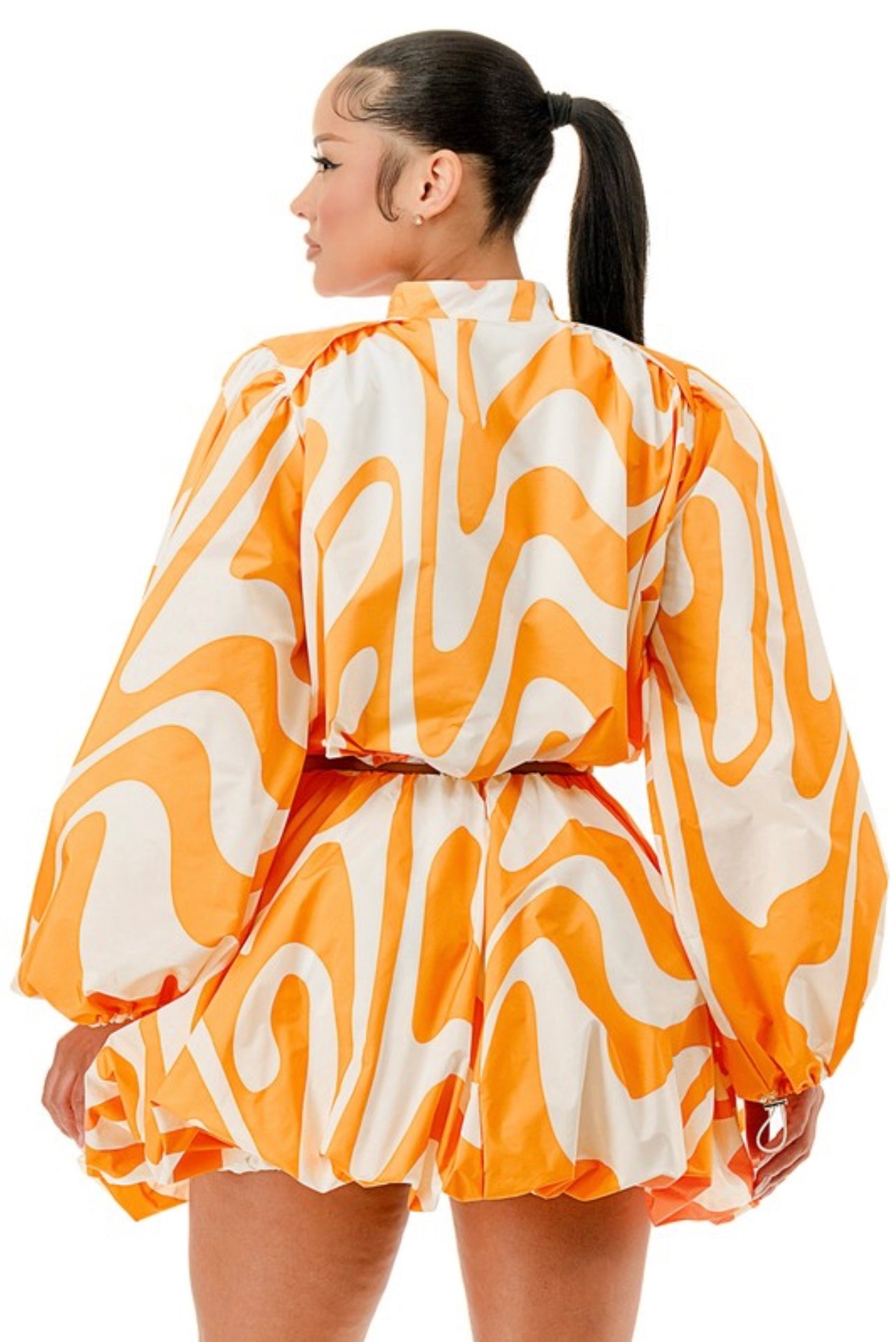 Bright, bold, and playful—the Kori Pop Set is a vibrant two-piece made for standout moments. Featuring a zip-up balloon sleeve crop jacket and a high-waisted mini skirt with an elastic waist, this set pops in a bold golden yellow and white swirl print. Flowy with a flirty edge, it’s the perfect combo of sporty and chic.