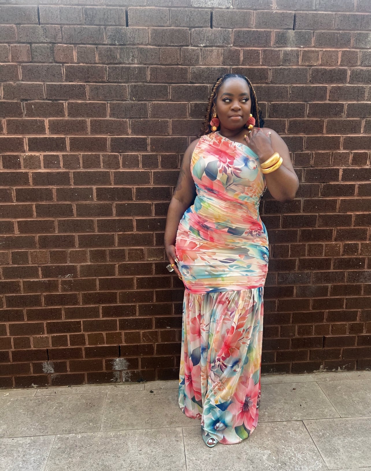 Soft, romantic, and effortlessly striking—the Liana Petal Drape Dress is a floral fantasy in motion. This one-shoulder ruched maxi dress features a body-hugging mesh bodice and a flowy chiffon-like skirt with an asymmetrical drape. The pastel watercolor floral print adds just the right dose of dreamy elegance, making this the go-to dress for standing out sweetly.