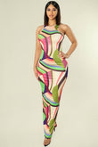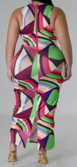 Elevate your style with our sleeveless maxi dress featuring a captivating multi-color geometric print and chic zipper back closure.