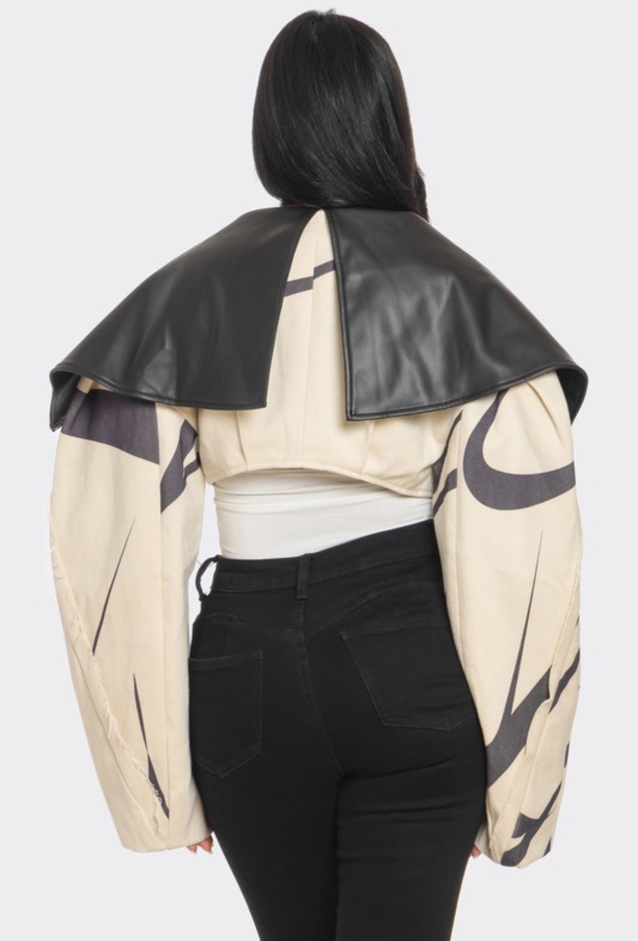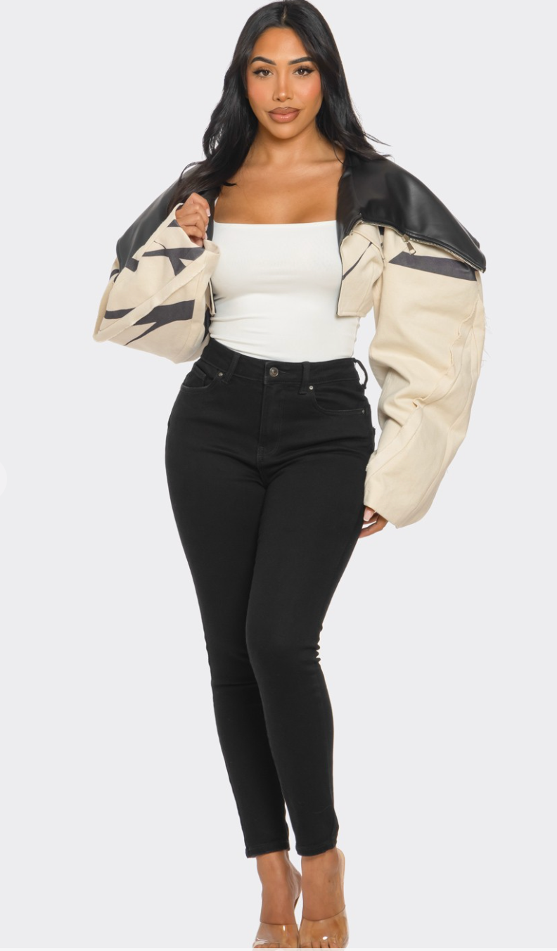 Elevate your style with this Urban Luxe Cropped Jacket, featuring oversized puff sleeves and a striking two-tone design. Crafted from soft beige canvas with a bold black faux leather shoulder panel, this modern bomber silhouette redefines edgy sophistication. The cropped cut, zip-up front, and exaggerated sleeves make it perfect for layering over casual ensembles or adding a statement touch to polished looks.