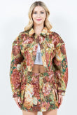 Step up your outerwear game with this floral cargo cropped jacket! Featuring a button-front closure, slim-fitting design, and cargo pockets, this stylish piece adds a bold touch to any look. Available in a range of stunning colors like cognac, light and dark green, pink, teal, and burgundy, it’s the perfect blend of feminine and edgy. Pair it with your favorite bottoms for a chic, effortless vibe.