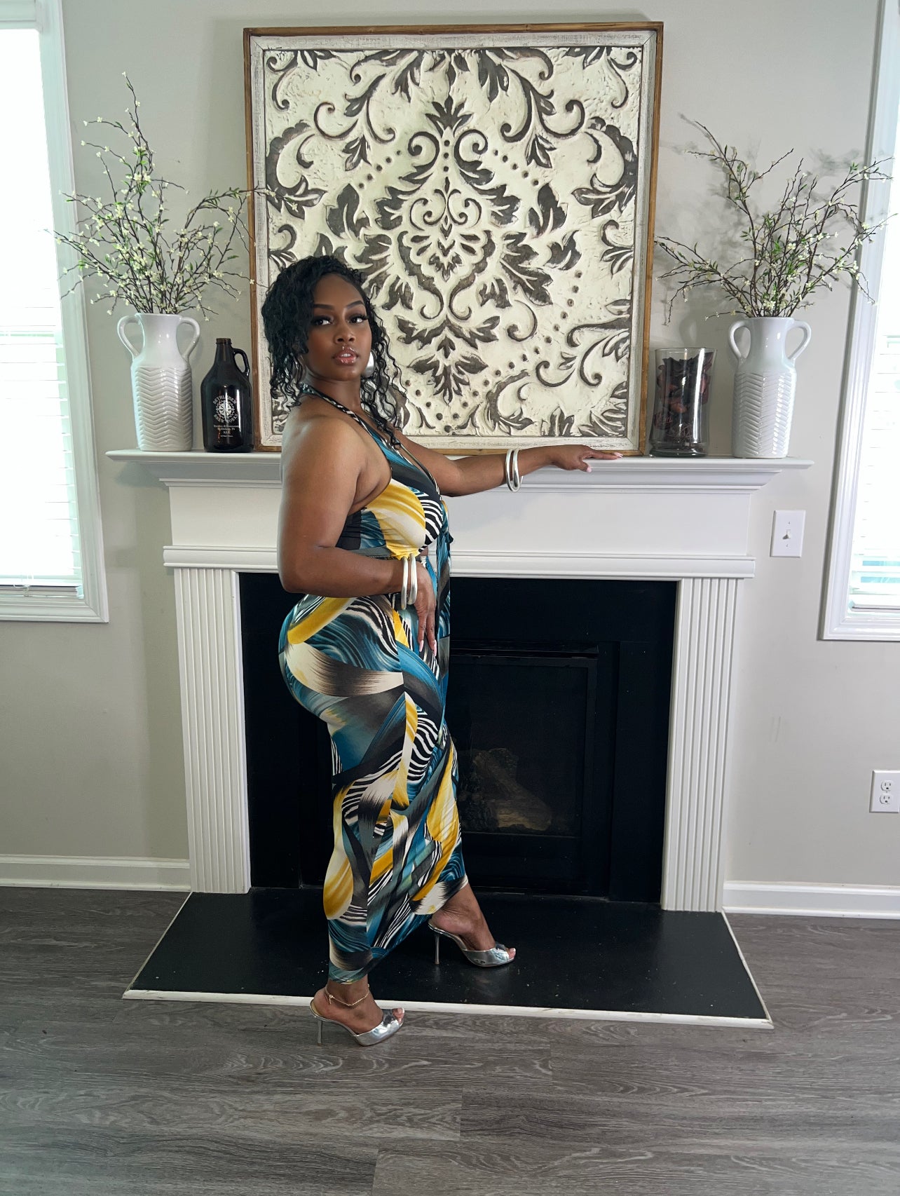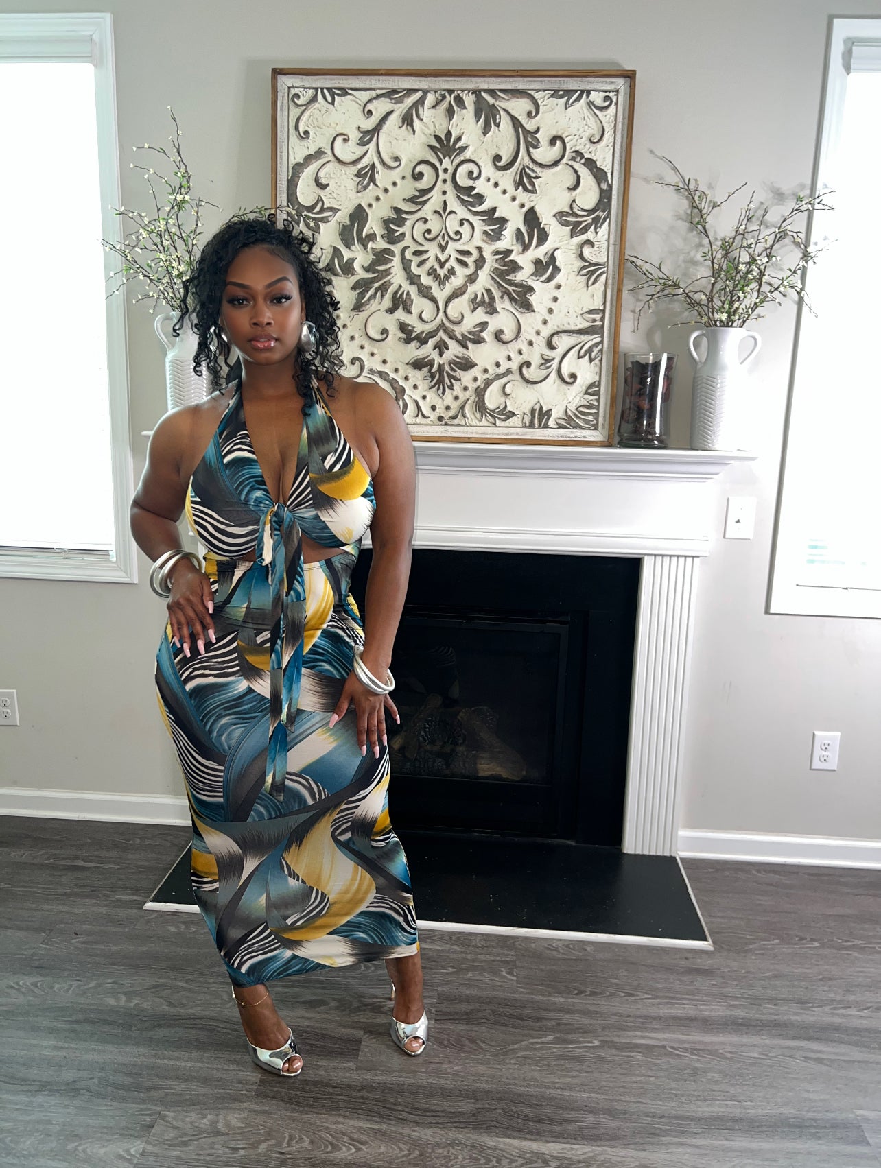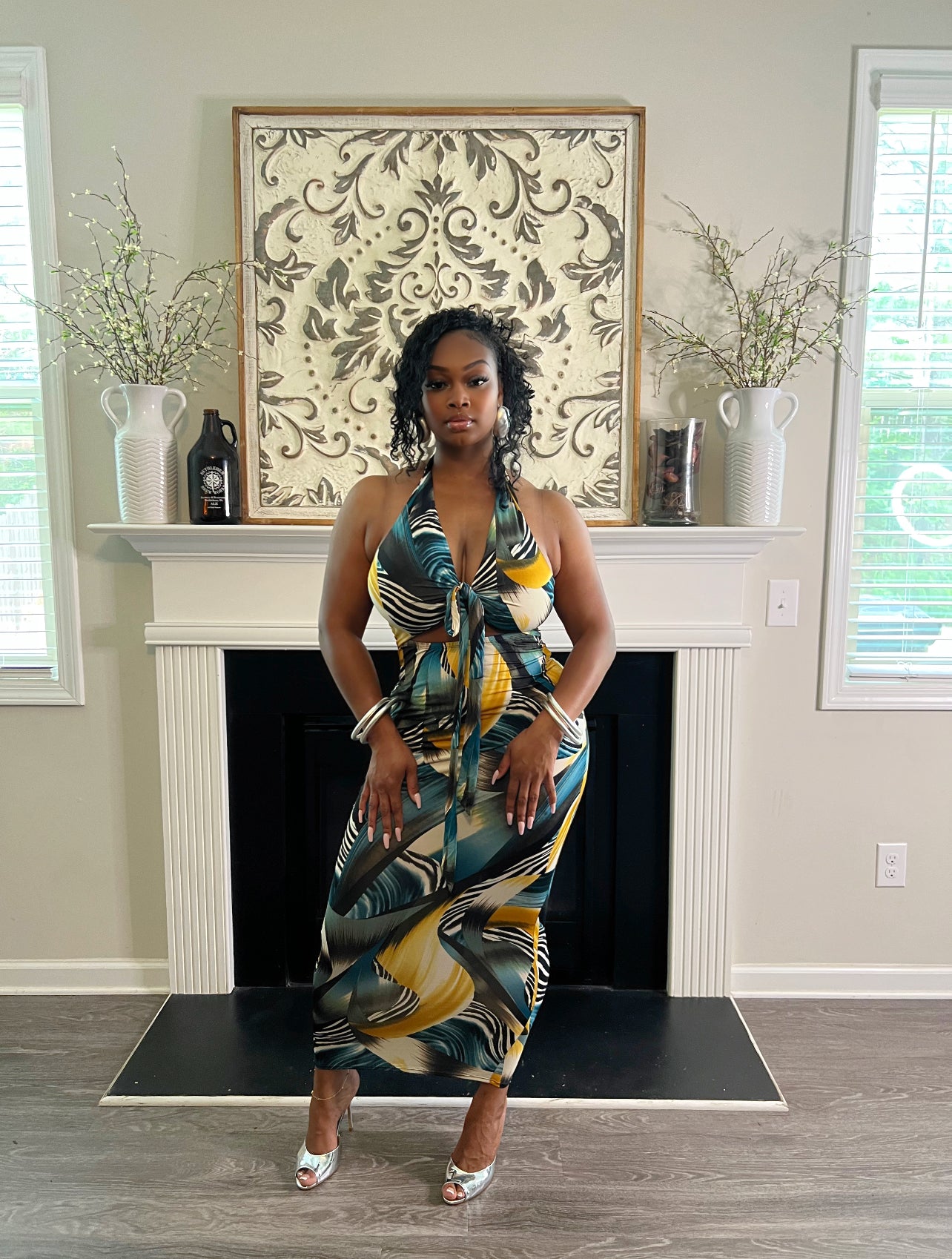 Command the room with every step in the Sway & Slay Halter Maxi Dress—a sultry statement-maker that hugs your curves and flows with ease. This bold printed maxi features a halter neckline with front tie detail, a body-hugging fit, and a floor-grazing hemline that delivers head-turning movement. The abstract print in rich tones brings an elevated edge to this effortless slay.