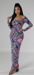 Make a bold statement in the Tropic Seduction Maxi Dress, featuring a vibrant mix of black, white, neon green, pink, baby blue, royal blue, and denim blue. With an off-the-shoulder neckline, button-down detail, and a flattering slit, this stretch maxi dress hugs your curves effortlessly while keeping you comfortable.